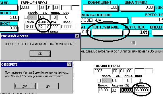 | Доколку е одбрана некоја од шифрите за акциза на алкохолни пијалоци или пиво, Каспер автоматски го бара и степенот на алкохол, што се внесува во полето за контингент. Бидејќи за пивото акцизата може да се пресметува на два начина, по степен на алкохол или по степен на екстракт, Каспер нуди опција да ја изберете пресметката и истата ја извршува и запишува во соодветното поле. |