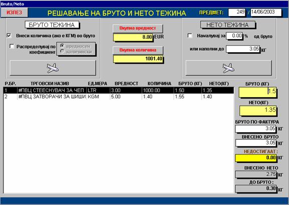 Решавањето на бруто и нето тежината по декларација сега е поставено на еден екран, со сите опции што ги содржеа и предхоните екрани. |