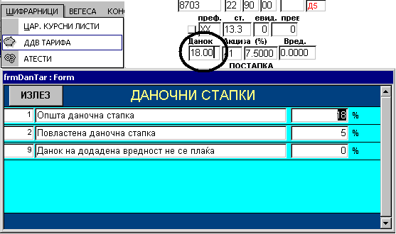 | Со избор на “Шифрарници” и “ДДВ Тарифа” се доаѓа до екран каде што можете сами да ги менувате даночни стапки (општа и повластена). Процентите на стапките што тука ќе ги запишете ќе се внесуваат автоматски во полето за даночна стапка. НАПОМЕНА: Веќе внесените вредности на стапки во старите предмети остануваат такви какви што се внесени. За да се изменат потребно е преажурирање на истите. |
