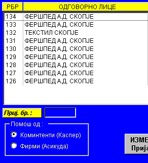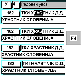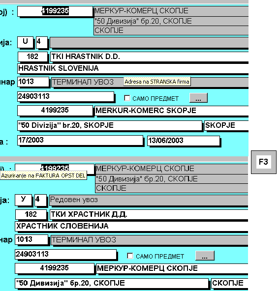 | Типката F3 се користи доколку сакате сите полиња што се пополнуваат на активниот екран да ги конвертирате во спротивен коден распоред (македонски во latinica и обратно). Со притискање на оваа типка сите полиња се конвертираат во ист коден распоред (пр. Македонска кирилица), а со следното притискање на истата типка тие се конвертираат во спротивниот коден распоред (Latinica). |