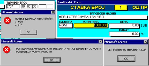 | Со измените на Царинската Тарифа се отвори и можноста за некои тарифни броеви да се избира која единица мерка ќе се применува. Овие тарифни броеви, при тарифирање на ставките, Каспер ги открива и ги прикажува со порака. Зависно од тоа која единица мерка е веќе внесена во соодветното поле, Каспер реагира на следните начини: Доколку внесената Единица мерка ја нема во единиците мерки кои можат да се применат, ја заменува со првата од листата и се враќа на полето за количина, со опомена да се провери количината; доколку внесената Единица мерка е било која од оние кои можат да се применат, ја задржува истата. |