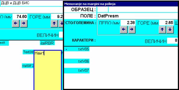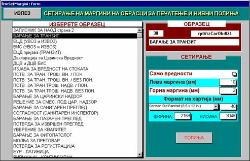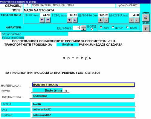 | На овој екран се селектира полето кое сакате да го менувате, при што можете да му ја смените неговата местоположба на образецот (со стрелки или со пишување на вредности), ширината и висината на полето, големината и здебеленоста на буквите и поставеноста на карактерите во однос на полето (лево, централно или десно). Откако ќе ги направите потребните измени, истите се запишуваат со копчето “Запис” на десната горна страна на прозорот. |