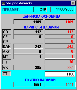 | Постоечката пресметка на вкупните давачки по активниот предмет е проширена со новата давачка CT (19 EUR по декларација). НАПОМЕНА: Давачките се прикажуваат само доколку се формирани наименованијата. |