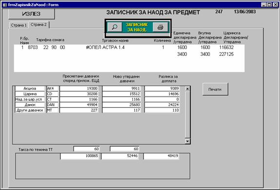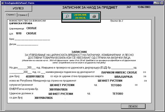 | Со притискање на копчето “Записник за наод” се доаѓа до екран каде што се прикажани двете страни на истиот образец (за коли) со пополнети полиња. Може да се печати секоја страна поединечно. |