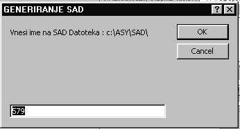 Pri pritiskaweto na tipkata "Vo ASYCUDA" sega se pojavuva ekran na koj e sugeriran referentniot broj t.e. imeto na SAD datotekata, prevzemen od poleto "Referenten broj" ili, dokolku toa pole ne e popolneto, brojot na predmetot. Nastavkata .SAD ne se dopi{uva. |