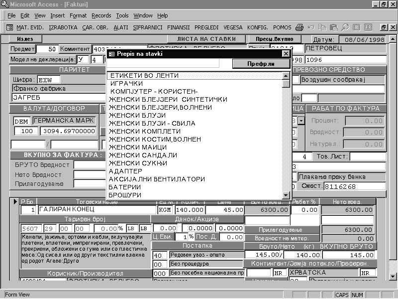 Pri vnesot na stavkite od INO-faktura, dodeka e kurserot na poleto za reden broj na stavka se pritiska tipkata F1 so {to na ekranot se pojavuva selektirana lista po trgovski nazivi na site stavki {to bile prethodno vneseni vo izrabotka na predmetite. So tipkawe na bukvi, "KASPER" ja prebaruva listata i gi nao|a ispi{anite bukvi na bilo koe mesto vo trgovskiot naziv i ja skratuva listata samo na onie stavki kade {to bukvite se najdeni. |
