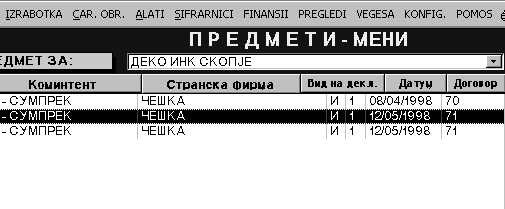 Vo poleto {to se nao|a nad listata na predmeti mo`e da se odbere eden komintent i toga{ listata }e se ograni~i samo na predmeti za odbraniot komintent. Sortiraweto po broj na predmet, firma, datum, dogovor i sl. va`i i za ovaa lista