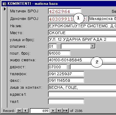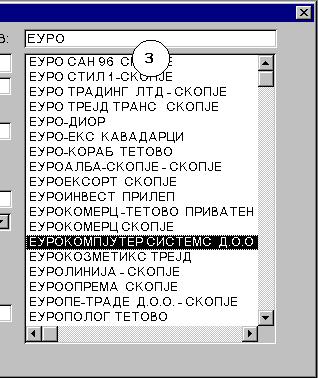 PREBARUVAWETO NA KOMINTENTITE PO IME SE PRAVI NA TOJ NA^IN [TO VO OVAA LISTA TIPKATE BUKVI PO KOI SAKATE DA BARATE, A "KASPER" JA STESNUVA LISTATA PO ISTITE. ZBOROT (BUKVITE) [TO GI BARATE VO LISTATA NE MORA DA SE NAO\AAT NA PO^ETOK NA REDOT OD LISTATA. NA PR. DOKOLKU OTTIPKATE "SKOP" "KASPER" ]E VI GI PRIKA@E SITE FIRMI KOI GO IMAAT TOJ ZBOR VO NAZIVOT. SO PRITISKAWE NA STRELKA NADOLE VLEGUVATE VO LISTATA I GO ODBIRATE KOMINTENTOT KOJ SAKATE DA GO A@URIRATE. |