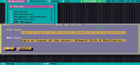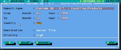 MODCHQ - SET UP AND MAINTENANCE Ó UNCTAD – SITE (V1.15) 10.30 Fig. 10.23 Any module Hint editing <Ctrl>T If you are using any language except English, then before pressing  <Ctrl> H or <Ctrl> T,  you  should  select  your  own  language  from  the  Options  menu.  More details on managing Help can be found in the Technical documentation. ASYCUDA Reporting: Extractions of Statistical Data Most  statistics  from  ASYCUDA++  will  be  obtained  through  SQL,  however  a  group  of  predefined statistical reports can be obtained using this option.  They are listed in the form of three databases plus  Loss  of  Revenue.  This  is  to  provide  continuity  for  people  familiar  with  previous  versions  of ASYCUDA that used this three-database structure. Standard Reports The reports are produced on the server as either a server printout or file.  If the report is requested as a server file it may be transferred to your client machine and printed locally. The screen to request all the printouts is very similar, as an example the screen for requesting the ‘Customs   Database’,   ‘General   Trade’,   ‘Countries/Products’   report   is   shown   below.   Under   the ‘Customs Database’ the ‘General’  and ‘Special Trade’ options allow for the data to be included in the report for different groups of ‘Extended Procedure’ codes as defined under that option. Fig. 10.24    MODCHQ : Functions: Statistics: General Trade: Countries/Products To choose either a Server printout or Server file you use the options button from this screen. The following window will be displayed which allows you to define the report's destination. It also allows you to set the priority of the process on the server.