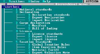 FINDING YOUR WAY AROUND ASYCUDA++ Ó UNCTAD - SITE (V1.15) 2.17 · Highlight  the  text  that  you  want  to  copy.  This  can  be  done  with  the  mouse  by  placing  the mouse at the start position, clicking and holding the left mouse button, moving the mouse to the end position and releasing the button. · <Ctrl> <Ins> to copy the selected block of text to the clipboard. · Position the cursor where you want to place the text and   <Shift>  <Insert>  to  paste  the  text from the clipboard. Hierarchical Menus Displays the menu structure.  This option may also be accessed directly by <Ctrl> <M>. This menu layout can also be selected as the default format on system start up - see  ‘Options: Environment: Startup’. See also Appendix C for a full list of Hierarchical Menus. Options (User Preferences) Languages Allows the user to select the language he wishes to work in. K C O H Fig. 2.11  All Modules: Options: Language. Normally  your  ASYCUDA++  system  will  have  only  your  national  language  installed.  If  you  have more than one national language, you may have more than one language installed, and from this screen you will have the choice of switching the display text from one language to another. The language of ASYCUDA++ as supplied by UNCTAD is English. It a task of the   Project   Implementation   team   to   arrange   any   necessary   translation   into National  language(s)  and  to  have  procedures  in  place  for  any  translation  of subsequent system updates. Note that even in countries that have English as the  national  language,  some  “translation”  may  be  needed,  e.g.  in  changing certain   words   or   descriptions   to   align   the   ASYCUDA++   screen   and   printed forms with National Customs terminology. See the Technical Documentation for details on the ASYCUDA++ utility programs used for translation. Fig. 2.10 Example of 'Functions' sub-menu using the hierarchical display option