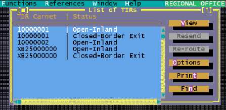 MODTRS - TRANSIT CONTROLS USING ASYCUDA++ Ó UNCTAD – SITE (V1.15) 7.18 ·     Store ·     Validation ·     Printout Validation of the TIR Carnet opens a window requesting the next intended Office of Destination and the maximum time delay for this transfer. If you have defined an Office of Departure in the reference country, the next intended office will automatically be defined this office. If you have defined an Office of Destination in the reference country, then the next intended office will automatically be this office. However, if you have not defined any Offices of Departure or Destination in the current country, this would imply that you are carrying out a through transit and the next intended office should be a Border Office of Exit. After the next office and the delay have been confirmed, validation is carried out. An ASY++ agent containing the TIR Carnet data is sent to the next intended office via the A++ Gate. The TIR Carnet is considered to be ‘OPEN-BORDER ENTRY’. Stored TIR With this option, the user can retrieve a stored TIR Carnet by its TIR Carnet number. The same operations as given for the local capture of a Border Entry Carnet are available for a stored TIR Carnet. Border Exit The Border Exit of TIR goods can only be carried out at a Border Office, i.e. the Border Office flag in UNCUOTAB must be set to  'Yes' for the current office. Border Exit is Closure of a TIR Carnet. (If the final destination of this TIR Carnet is inside your own country, then this operation is not permitted, since the goods are meant to be totally discharged.) The TIR Carnet is retrieved and only the data fields for the ‘Seals intact’ flag and ‘Reservations’ , (on the bottom right hand side of the voucher), can be completed. The TIR Carnet can be closed and then automatically sent as an ASY++ agent back to the Office where the TIR Carnet was last opened. When a Border Exit is carried out, the data field for number of packages discharged is set to ‘0’, since nothing is being discharged. The TIR is considered to be ‘CLOSED-BORDER EXIT’. Figure 7.8: ‘Functions’, ‘TIR Carnet’, ‘Print/Query’, ‘List of TIRs’. Generate Manifest This option allows you to place a TIR Carnet that has been partially or totally discharged under normal customs control by generating a manifest with bills of lading representing the discharged items. You are asked to enter the number of a TIR Carnet and the system then checks if : ·     The TIR Carnet has been partially discharged or totally discharged at the current office; ·     The TIR Carnet has not already been placed under Customs control.