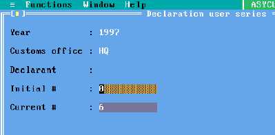 MODSYSCF - CUSTOMS OFFICE CONFIGURATION Ó UNCTAD - SITE (V1.15) 9.13 Series Management These options allow a number of functions to be performed on ASYCUDA numbering series.  They allow: ·     The Declarant Reference number to be managed ·     The labels for various Customs numbers to be defined ·     The management of Customs numbers to be managed. Fig 9.6 MODSYSCF Functions Series management Declarant References This option allows the Automatic Declarant reference number to be initialised. The number will be automatically reset annually to start at 1. ‘Current #’ shows the latest number automatically issued in this numbering series at the current date.                               Fig 9.7 MODSYSCF Functions Series Management Declarant References The number is just simply reset using this screen to whatever is required. (In the present numbering series, i.e. year and office combination, the ‘initial’ number cannot be set lower than the present ‘current’ number.) Numbering Types This option allows for the labels (descriptions) of different types of numbers to be customised to meet the requirements of the countries concerned.