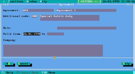MODCHQ - SET UP AND MAINTENANCE Ó UNCTAD – SITE (V1.15) 10.21 Agreements In  the  Agreement  table  you  can  list  Companies  and  Commodities,  which  are  to  receive  special taxation treatment.  This special treatment is normally some form of relief.  The syntax used for the Commodities   is   as   described   in   Section   9   of   this   Reference   Document   under   ‘Simplified management of the Tariff’, ‘Defining the Tariff Range’. Fig. 10.15  MODCHQ : Functions: Database Management: Customs Procedure Code: Agreement Agreements can be used in two different ways to achieve different types of relief. · General  -   If   the   relief   is   available   to   certain   Companies   irrespective   of   the   CPC   they   are declaring  their  goods  under,  then  an  appropriate  rule  can  be  inserted  in  the   ‘Agreement’  to cause the relief to be granted. · Specific - If a relief under an  ‘Additional Code’ is limited to certain Companies or Commodities then the Agreement record is set up differently. No rule is included in the Agreement but the Agreement itself is linked to the Additional Code that contains the rule giving the relief. The additional code record has a box that holds Agreement ‘Yes’/’No’. The agreement record has a box to insert the name of the appropriate ‘Additional Code’. Only if the importer requests the relief by declaring the ‘Additional Code’ does the system check that the importer/goods are eligible for that relief.  If they are not then the system will not accept the ‘Additional Code’ declared and gives an error message that the company/commodity are not authorised to receive the relief. An example of this would be a VAT relief that is available only to registered Companies.  If a rule exempting VAT were inserted in to the Agreement then no matter which Procedure code was used, a Company included in the Agreement would be relieved of VAT.  This is because no link to procedures is defined and the  system  checks  the  Agreement  table  for  all  declarations  to  check  if  the importer is eligible for some sort of relief.