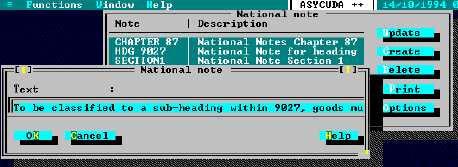 MODCHQ - SET UP AND MAINTENANCE Ó UNCTAD – SITE (V1.15) 10.7 Fig. 10.3  MODCHQ : Functions: Database Management: Customs Tariff: National Note These  notes  are  then  available  to  the  user  under  the  ‘Reference’  menu  option  query  option  in MODCBR.  See  Section  2  of  this  Reference  Document   ‘Reference  Menus  within  ASYCUDA Modules’ . Keywords This option allows the setting up of a list of words that are cross-referenced to Commodity Codes to allow a quick look up facility. When the keyword option is requested a list of Commodity Codes is displayed matching the keyword requested. Fig. 10.4  MODCHQ : Functions: Database Management: Customs Tariff: National Note A keyword list and the individual entries therein can be  ‘amended’,  ‘created’, or   ‘deleted’.  The screen asks for the Commodity Codes to be associated with the keyword. ASYCUDA++ is supplied with a default Keyword listing. Countries may need to edit  or  update  this  list  so  as  to  meet  their  national  requirements.  If  the  tariff  is translated into another language the Keywords list must be re-built. Tariff Components This menu has the following sub options: 1. Preferences, 2. Statistical Units, 3. Market Value, 4. General Note. 5. Quotas