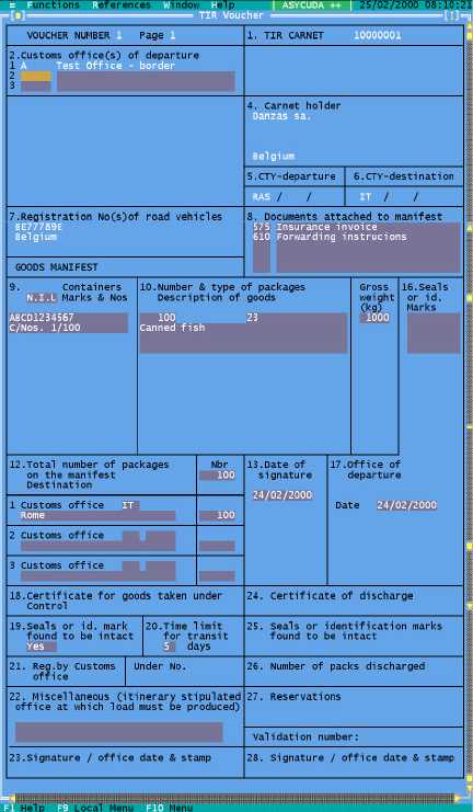 MODTRS - TRANSIT CONTROLS USING ASYCUDA++ Ó UNCTAD – SITE (V1.15) 7.12 Figure 7.2 ‘Functions’, ‘TIR Carnet’, ‘Open’, ‘F9 Local Menu’, ‘Voucher’ After completing the TIR Voucher details, the Carnet entry details can be checked by selecting ‘Local Menu’, ‘TIR Carnet’ , to move back to the first screen. Local Menu Checking and processing operations are carried out from the Local Menu of the TIR Carnet screen and not the voucher.