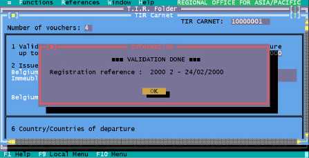 Figure 7.4 Functions, TIR Carnet, Open, F9 Local Menu, Validate Registration Stored